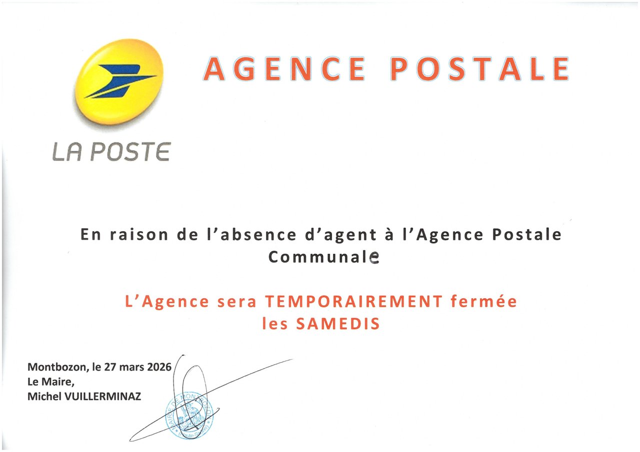 Fermeture TEMPORAIRE de l'Agence postale le samedi