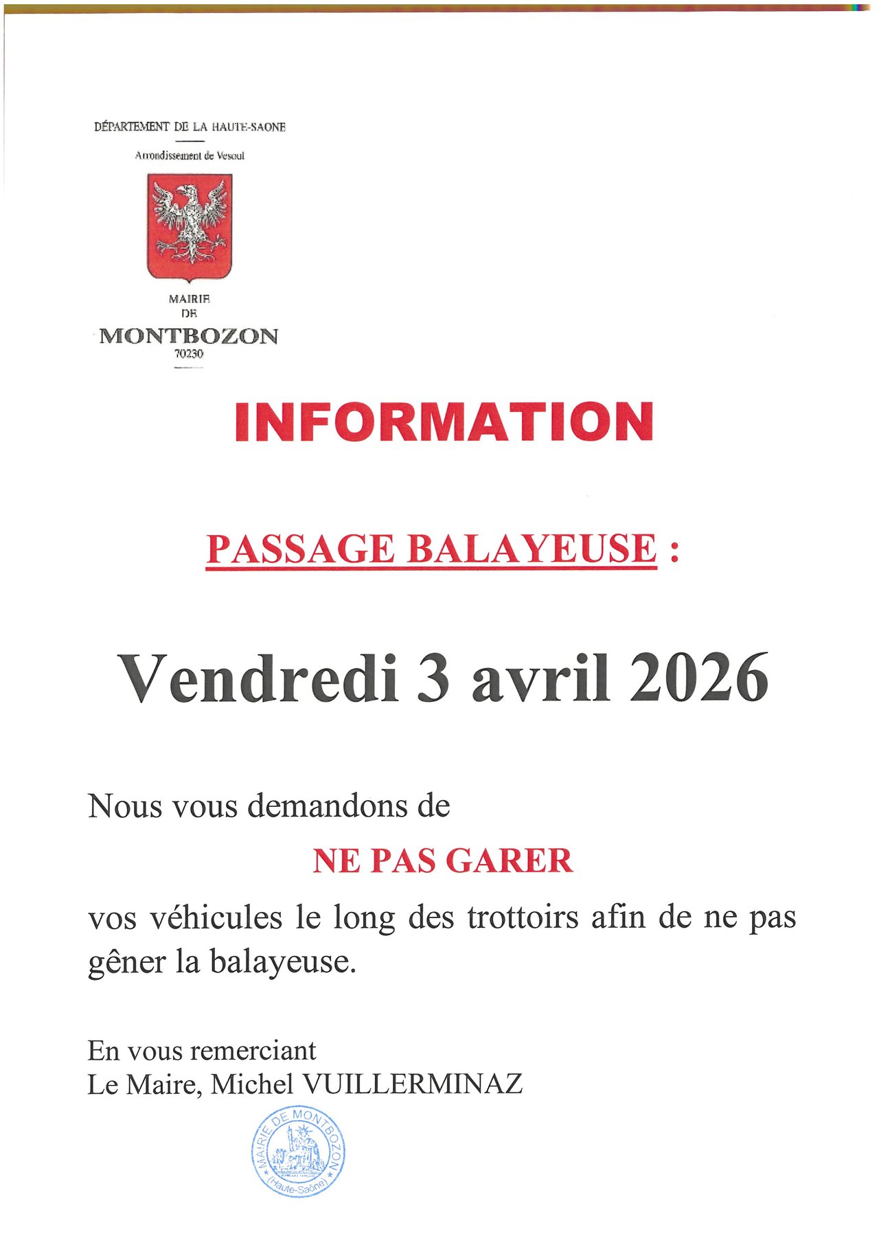 Pour rendre votre village propre, une balayeuse nettoiera, ce VENDREDI 3 AVRIL la voirie communale.
