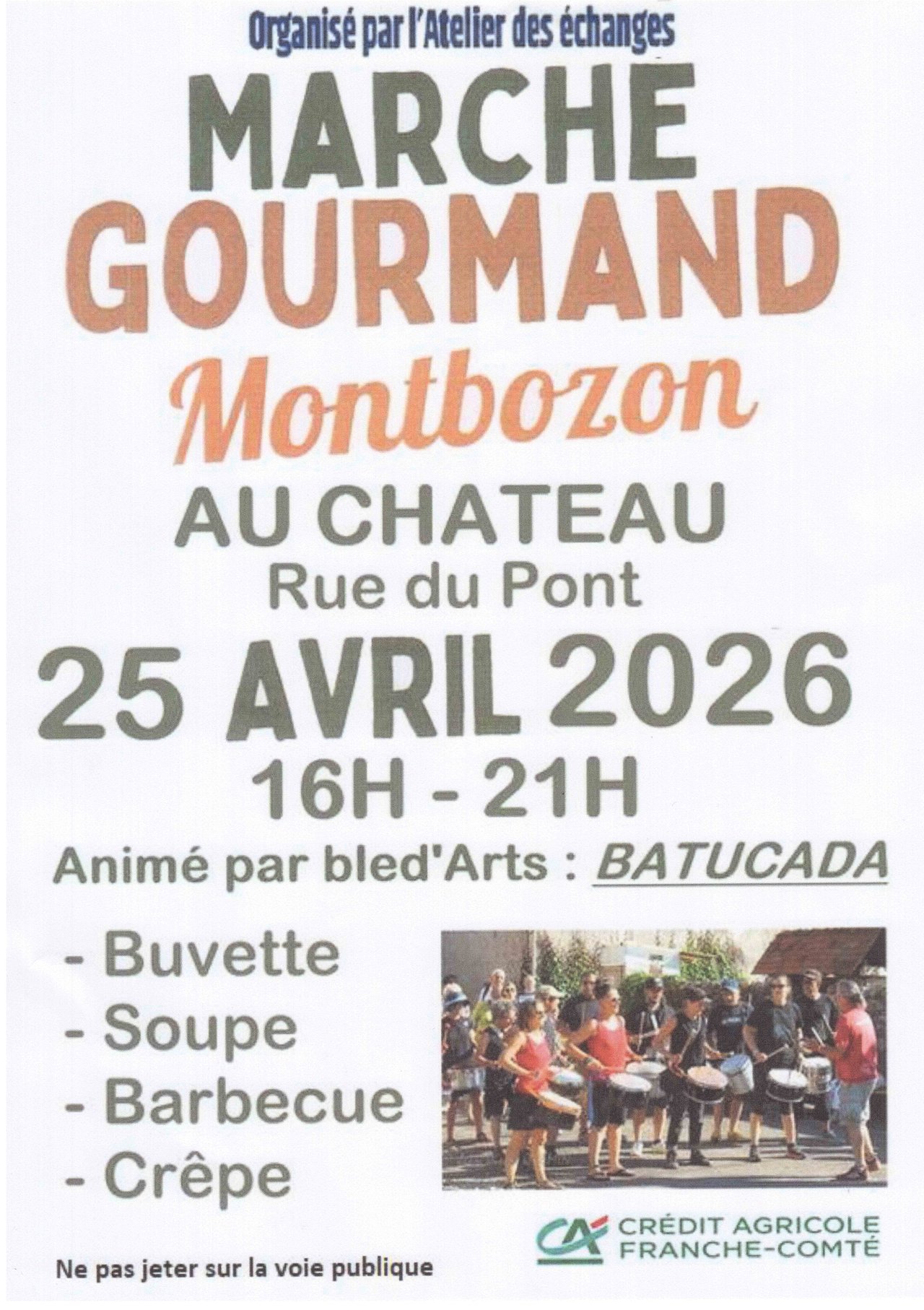 L'Atelier des échanges sera heureux de vous accueillir dans l'allée du château le 25 avril 2026 à partir de 16 h au 20 rue du pont Montbozon pour découvrir de nombreux produits régionaux proposés par les exposants.